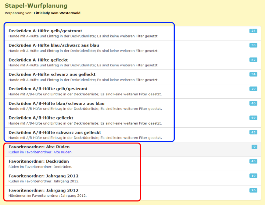 Mit klick auf den Button "Stapel-Wurfplanung" gelangt man zu einer Auswahlliste verschiedener Rüdengruppen aus der Deckrüdenliste (blauer Rahmen) und den Hunden aus den eigenen Favoritenordnern (roter Rahmen). Der Ordner "Default" wird nicht berücksichtigt. Die Zahl rechts gibt an, wie viele Hunde/Rüde in den jeweiligen Listen stehen.
