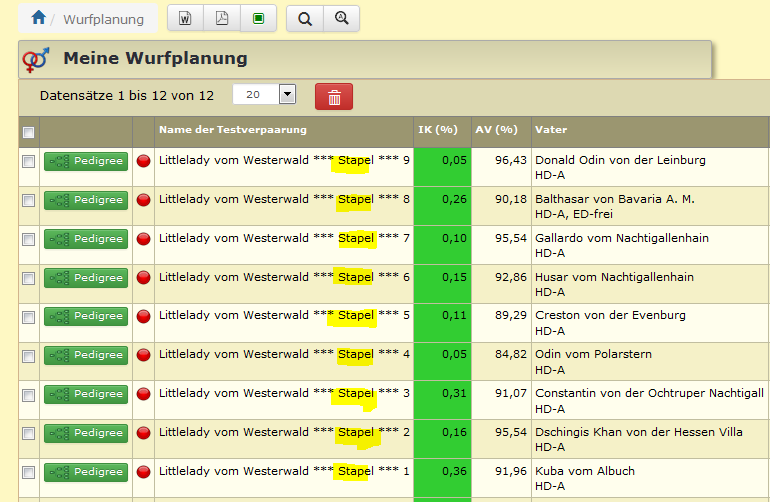 Durch klick auf die gewünschte Liste, wird eine Stapel-Wurfplanung mit der Hündin und allen Hunden/Rüden der Auswahlliste durchgeführt.